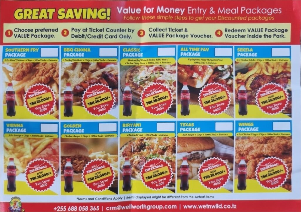 Für Erwachsene beträgt der Eintritt 18000 TZS (ca. 7,30 €) und für Kinder unter 1,20 m Körpergröße 15000 TZS (ca. 6 €). Man kann sich auch für ein Bundle mit einem Snack (Entry and Meal) entscheiden.